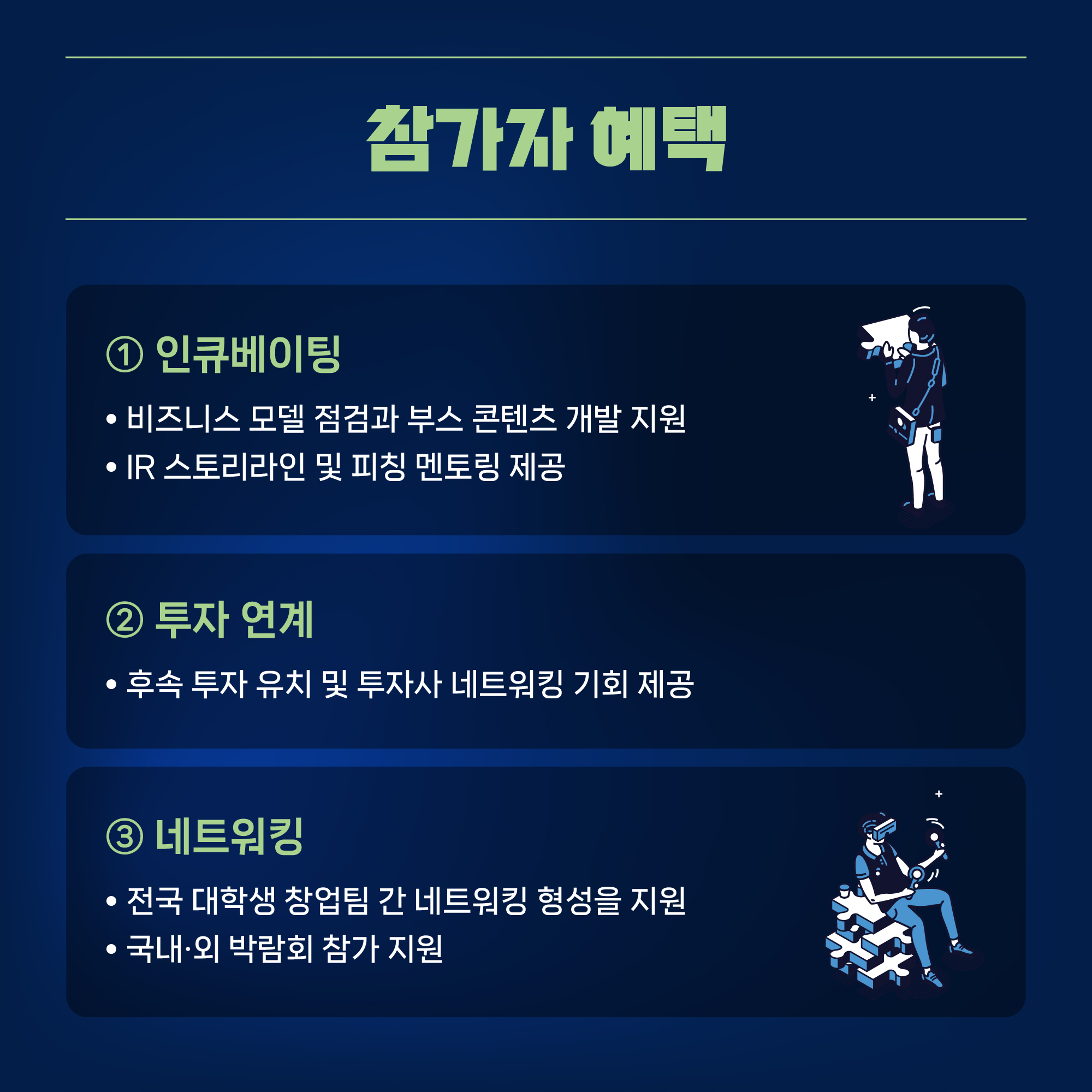 - 인큐베이팅 프로그램 및 투자 연계 기회 제공